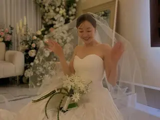 ในภาพที่เผยแพร่ อึมจีวอน สวมชุดแต่งงานสีขาวล้วนเปิดไหล่และมีผ้าคลุมหน้า