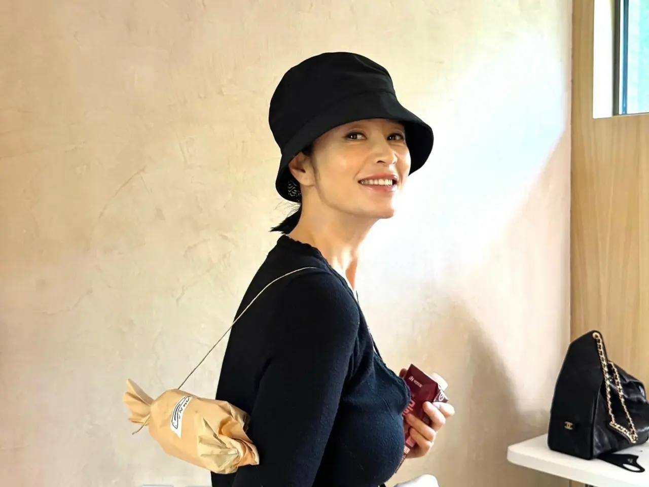เขากำลังยิ้ม แม้ว่าเธอจะสวมเพียงหมวกบักเก็ตและเสื้อคาร์ดิแกนถัก แต่ออร่าของคิมฮเยซูก็ไม่สามารถซ่อนไว้ได้