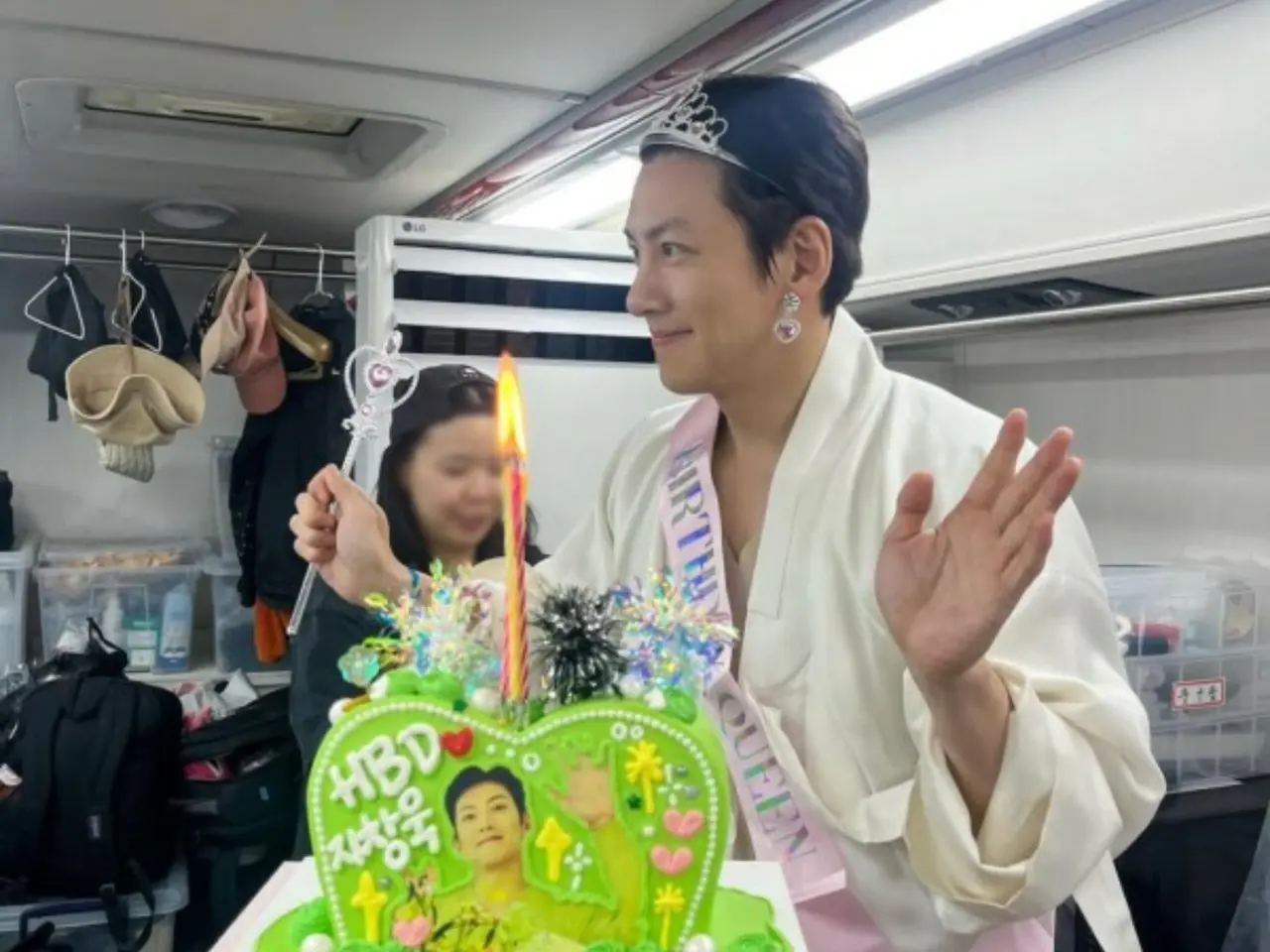 จีชางอุคแปลงร่างเป็นเจ้าหญิงสุดเพอร์เฟ็กต์ด้วยเค้ก จีชางอุคเป่าเทียนบนเค้กที่ตกแต่งอย่างสวยงามและทักทายพนักงาน