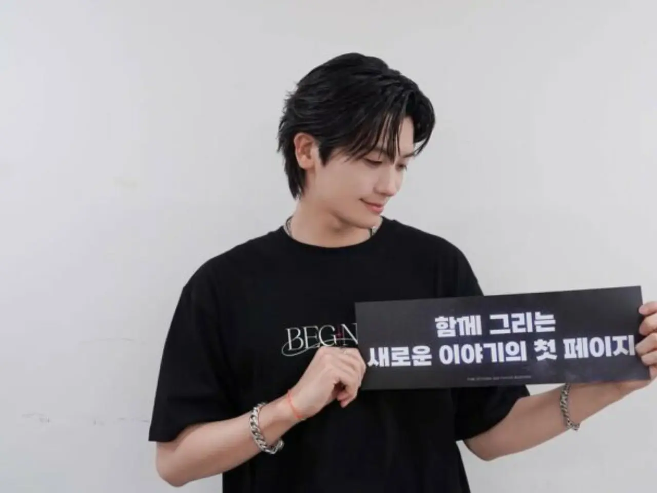 ภาพนี้แสดงให้เห็นพัคฮยองชิกสวมเสื้อยืดสีดำและถือสโลแกน พร้อมข้อความว่า "หน้าแรกของเรื่องราวใหม่ที่เราจะร่วมกันเขียน"