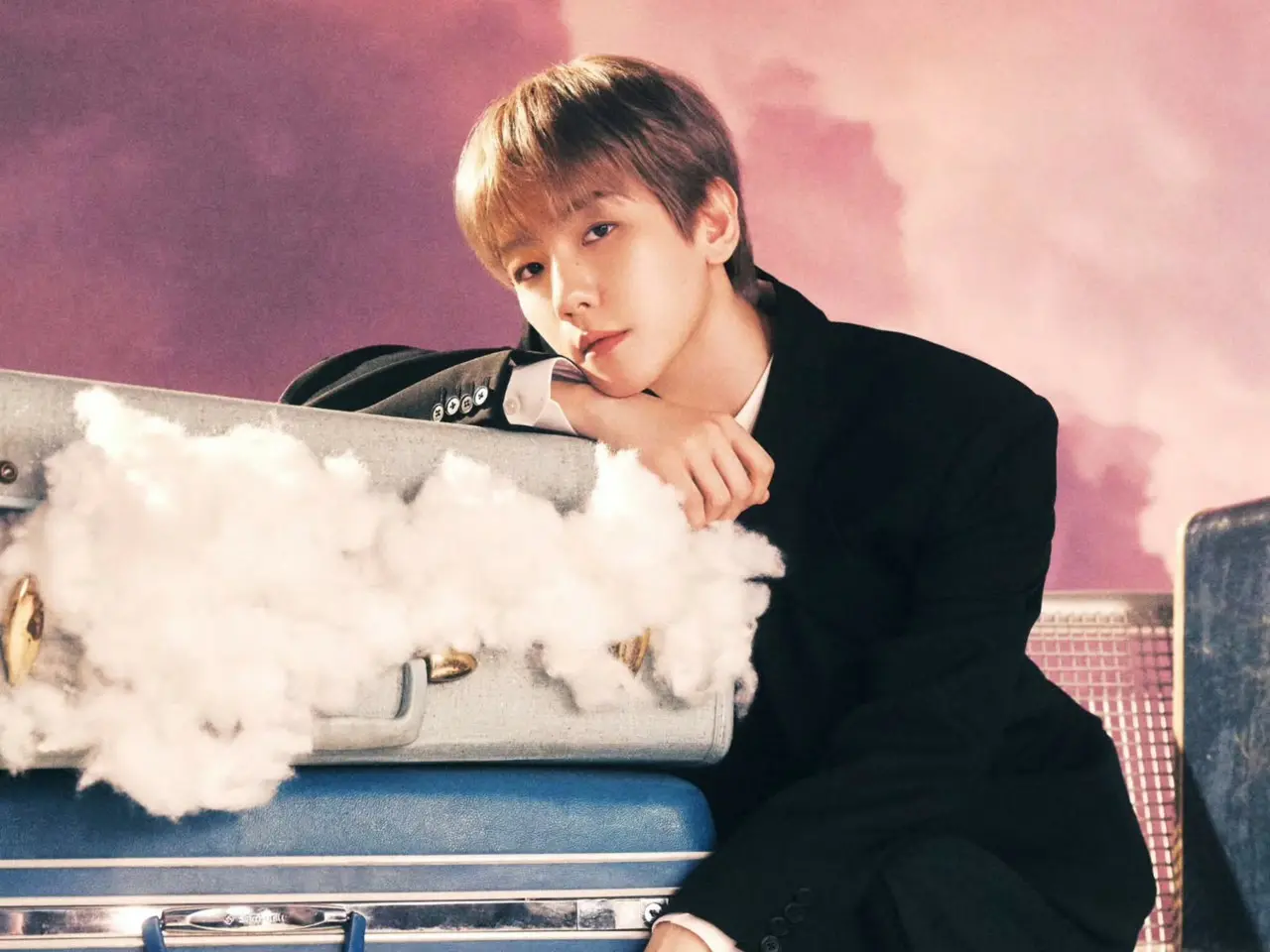 ในภาพที่ปล่อยออกมา แบคฮยอนแสดงสีหน้าสงบและท่าทางผ่อนคลายในพื้นที่ที่เต็มไปด้วยก้อนเมฆและกระเป๋าเดินทางวินเทจ สร้างลุคที่ไม่เหมือนใคร